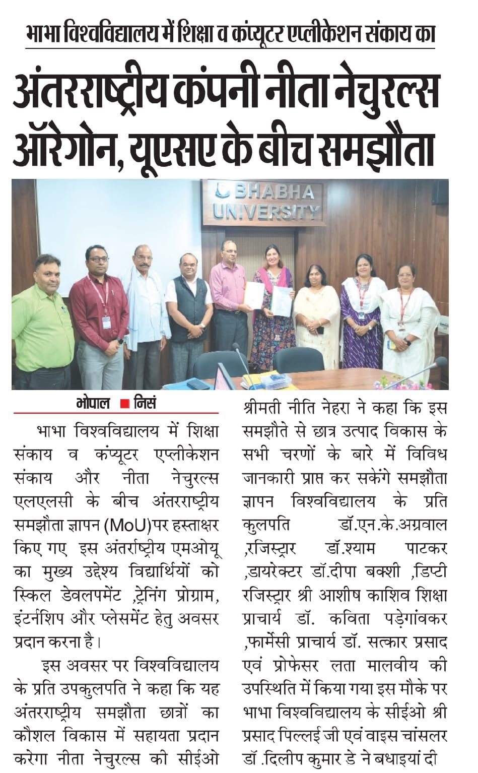 Bhopal, India – Bhabha University has entered into an international Memorandum of Understanding (MoU) with Neeta Naturals LLC, Oregon, USA. The collaboration, signed between the Departments of Education and Computer Applications, aims to provide students with opportunities in skill development, training programs, internships, and global placements.